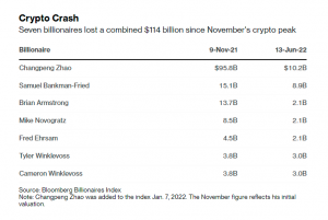 According to the Bloomberg Billionaires Index, seven billionaires with crypto fortunes were worth approximately $145 billion on November 9, 2021, when Bitcoin reached a new high of about $69,000. Amid the crypto bloodbath, these seven bitcoin-billionaires have lost a combined fortune of $114 billion since June 13.