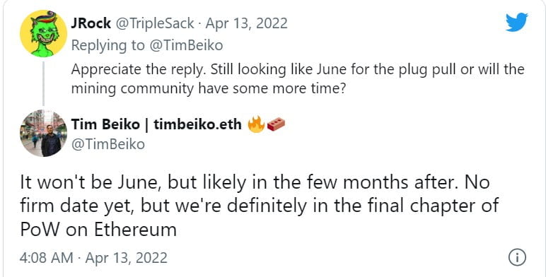 Following weeks of speculation, Ethereum core developer Tim Beiko announced in a tweet on Tuesday that the much-anticipated Ethereum Merge would be delayed. Beiko noted that the network’s switch to proof-of-stake is more likely to happen “in the few months after” than in June.