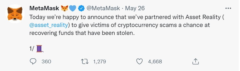 On May 26, Metamask, a cryptocurrency wallet, announced a partnership with Asset Reality, a platform for accessing and retrieving confiscated crypto and digital assets, to assist users in recovering stolen funds. Customers must pay any necessary litigation fees, which are not included in the service.