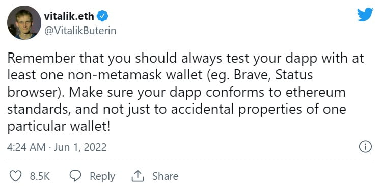 He emphasised that every dApp, excluding MetaMask, should be tested with at least one wallet. For example, it’s useful to see how it works with browsers that include built-in wallets, such as Brave and Status.